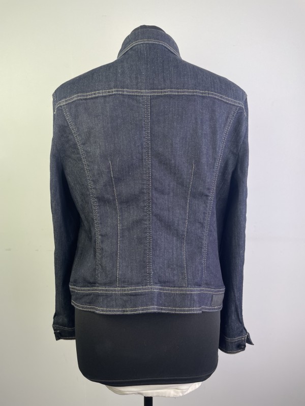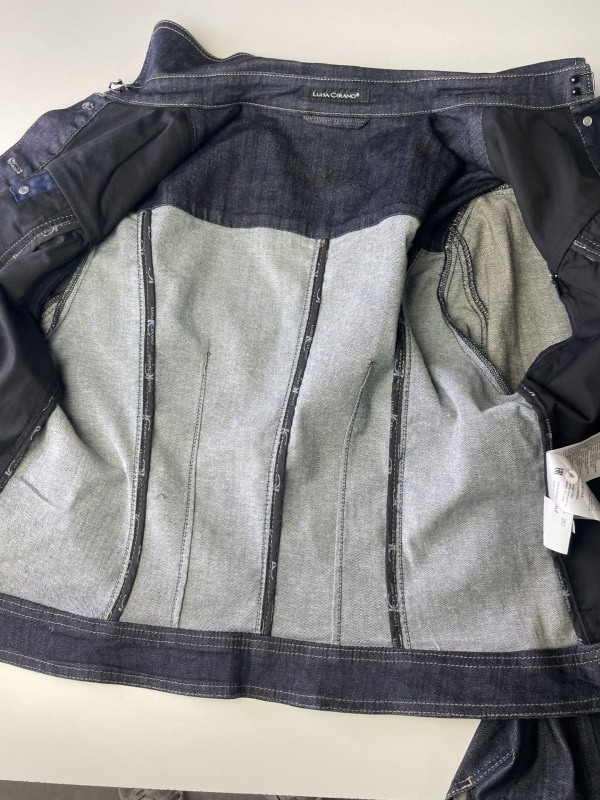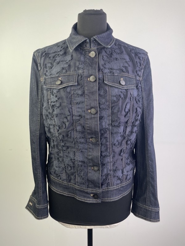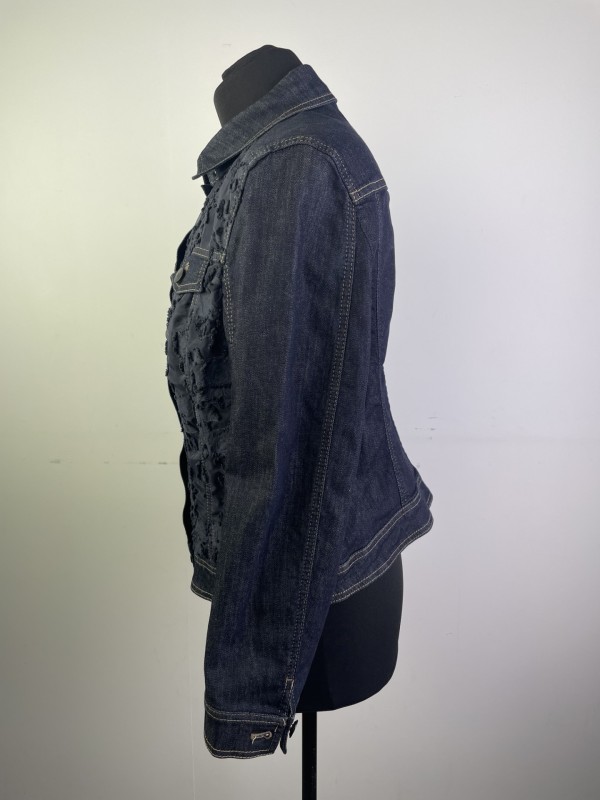 Unieke donkerblauwe jeansvest met bloemenmotief gemerkt Luisa Cerano, aangegeven maat is 44 (Duitse maat) wat eerder zou overeenkomen met maat 46 bij ons.