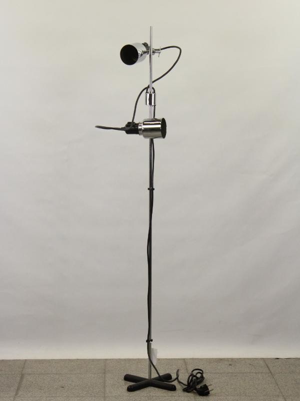 Stijlvolle, vrij lage design vloerlamp uitgevoerd in een combinatie van chroom en zwart.