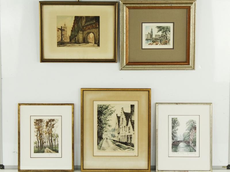Vijf kleurenetsen van de Belgische kunstenaar Roger Hebbelinck (1912-1987)
