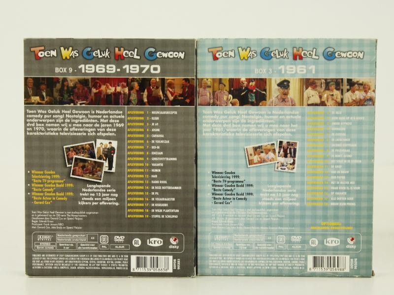 Dit lot bestaat uit meerdere DVD-boxen van de Nederlandse televisieserie Toen Was Geluk Heel Gewoon. De boxen omvatten verschillende jaargangen uit de reeks en zijn uitgegeven door KRO/Disky. Het betreft complete seizoensboxen met telkens meerdere afleveringen per box, verspreid over meerdere DVD’s.