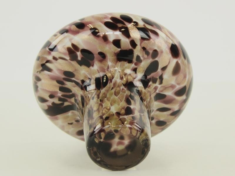 Het glas is rijk gedecoreerd met een gevlekt patroon in tinten van bruin, roze, zwart en goud, waarbij de glanzende afwerking en subtiele metallic schittering.