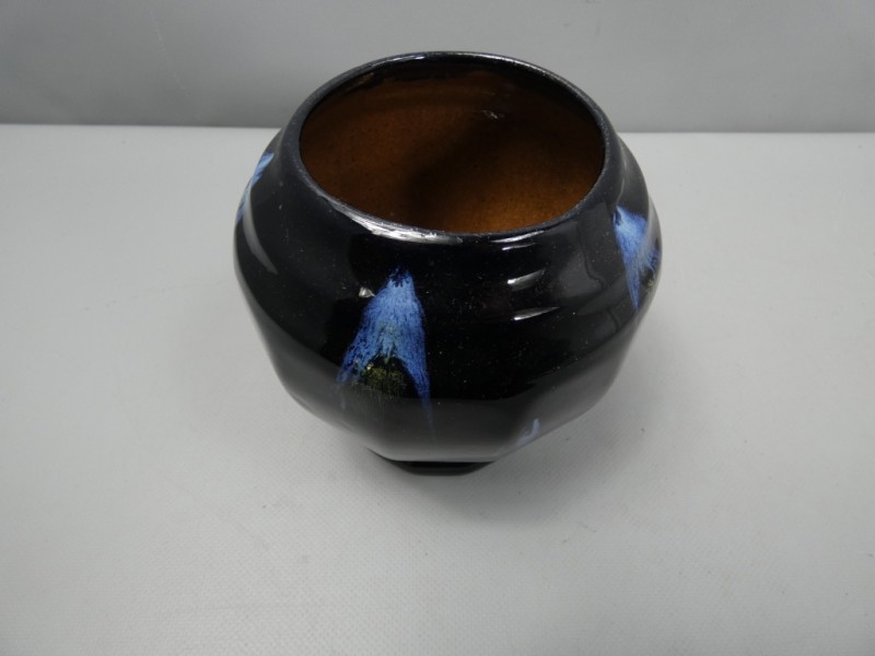 Het meest opvallende kenmerk is het glazuureffect, waarbij er strepen of druppels van helderblauw, en mogelijk ook een vleugje geel of groen, over het donkere oppervlak naar beneden lopen. Dit geeft de vaas een decoratief, vloeibaar uiterlijk.