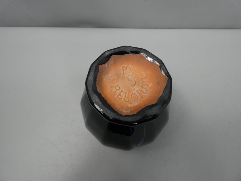 Deze vaas is een glanzende, donkergekleurde (waarschijnlijk zwart) vaas met een bolvormig lichaam en een verhoogde, achthoekige voet.