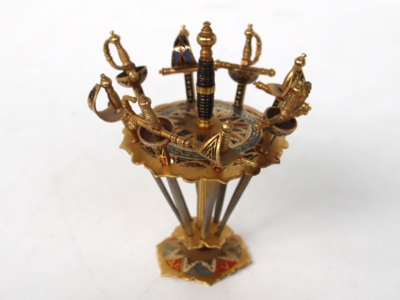 Een vintage set Toledo cocktailprikkers in de vorm van miniatuurzwaarden, compleet met een bijbehorende houder.