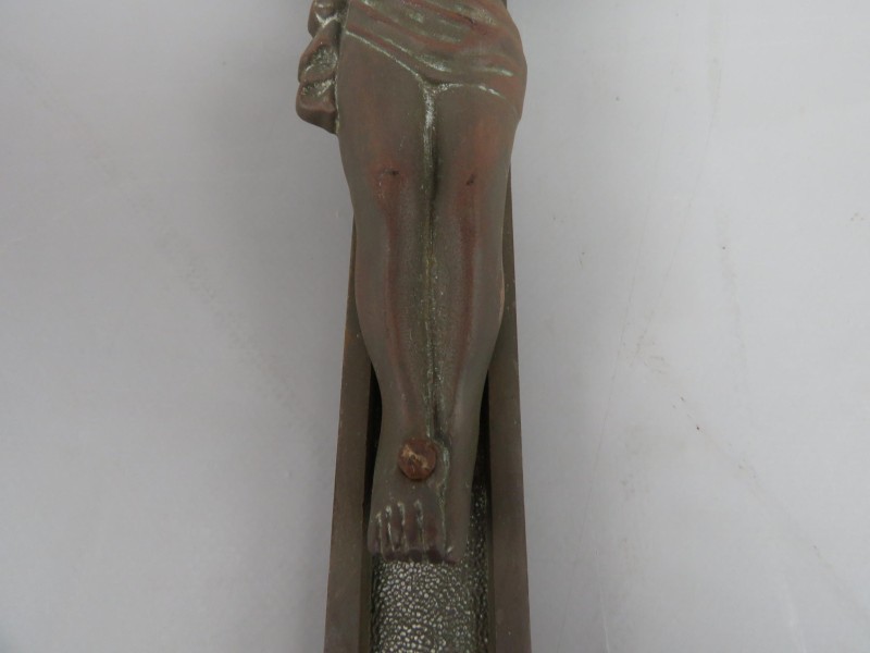 Kruis van metalen legering met een Jezus aan genageld. Gesigneerd Inri.
