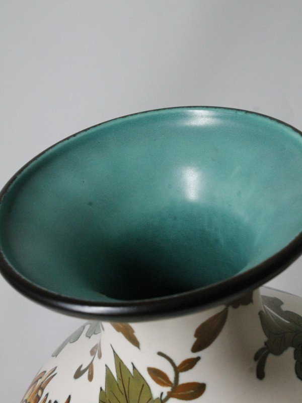 Een aardewerken vaas met sierbord. Ze zijn gemaakt van keramiek. De set combineert een vaas en een sierbord dat kan dienen als wanddecoratie. De stukken zijn handgeschilderd met bloemen en bladeren in de kleuren blauw, groen, bruin en paars. De zwarte rand en turquoise binnenzijde geven het geheel een extra kleuraccent wat het levendiger maakt. De vaas is gemarkeerd met modelnummer '2694' en het sierbord heeft modelnummer '4817'.