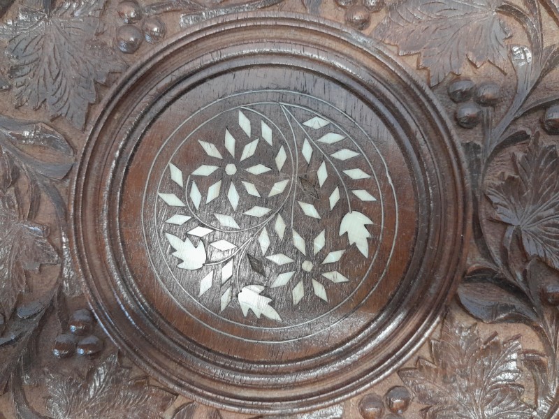 - Het achthoekige blad is prachtig gedecoreerd met een centraal ingelegd bloemmotief, omringd door sierlijk bladmotiefsnijwerk en ingelegde randen.