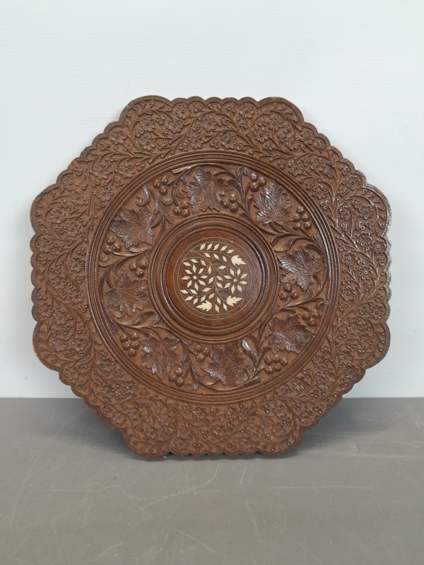 Prachtige Anglo-Indiase achthoekige vouwtafel, rijk gesneden hardhout – eind 19e / begin 20e eeuw. Deze bijzondere Anglo-Indiase achthoekige vouwtafel is een echte blikvanger en combineert exotische elegantie met praktisch gebruiksgemak. Vervaardigd uit rijk gesneden hardhout, vermoedelijk teakhout of palissander, en afgewerkt met verfijnde ingelegde details van messing en been, straalt deze tafel vakmanschap en karakter uit.