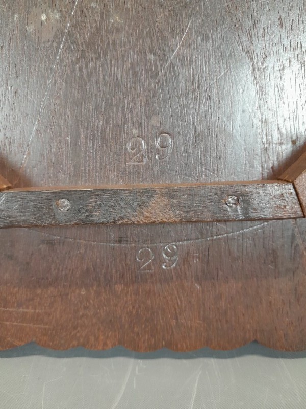 - Aan de onderzijde van het blad bevindt zich het gestempelde nummer 29, wat bijdraagt aan het authentieke karakter van het meubel.