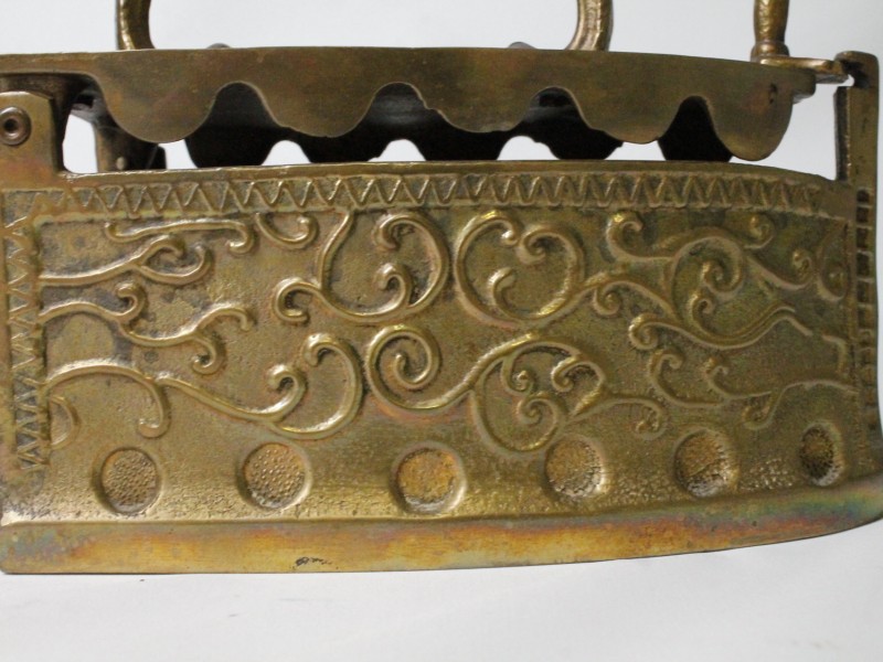 Een vintage, antiek-stijl strijkijzer dat oorspronkelijk werd gebruikt door het vullen van hete kolen. Het strijkijzer heeft gedetailleerde decoratieve gravures en een sierlijke handgreep. Het is gemaakt van messing.