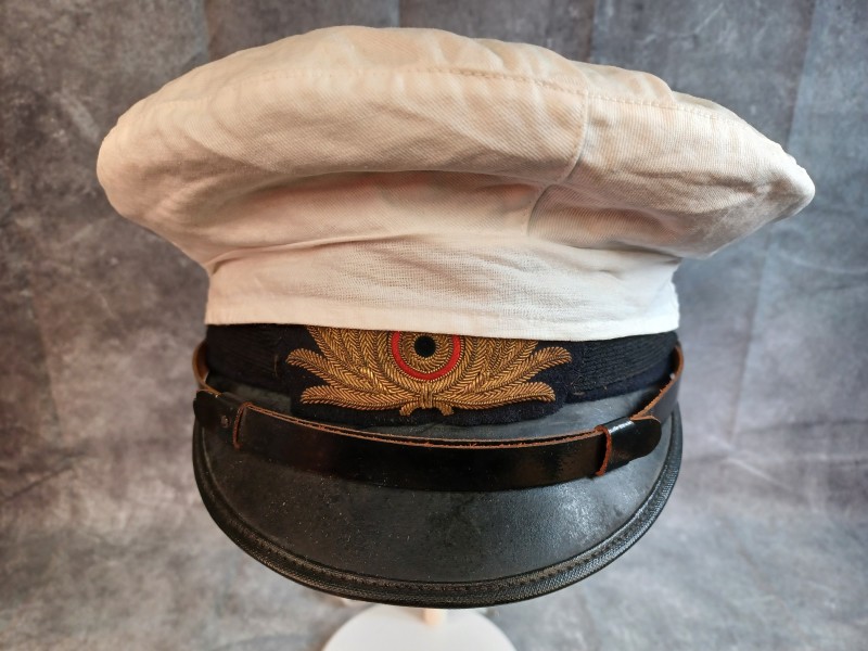 Dit is een prachtig bewaard gebleven militair verzamelobject. Op basis van de stempels binnenin gaat het om een authentieke officierspet van de Belgische Zeemacht uit 1951.
