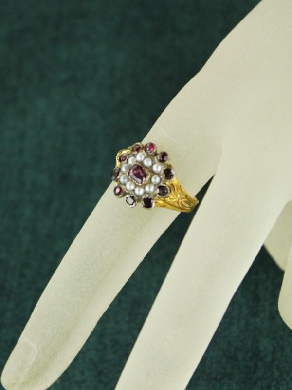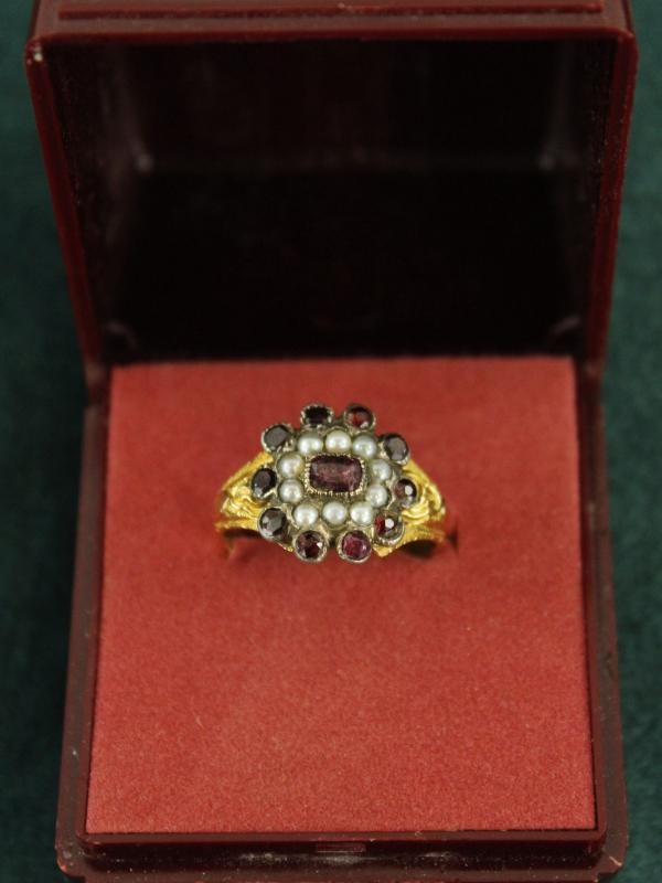 Antieke gouden ring (15 karaat) gedecoreerd met parels en paarsrode steentjes in de vorm van een bloem.
