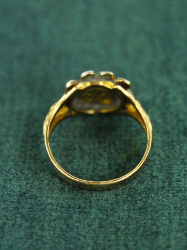 De middelste steen is beschadigd (een hoek ontbreekt). De bloemvorm lijkt ooit los te zijn gekomen en terug te zijn gesoldeerd met een ander metaal aan de ring (zie foto 6).
