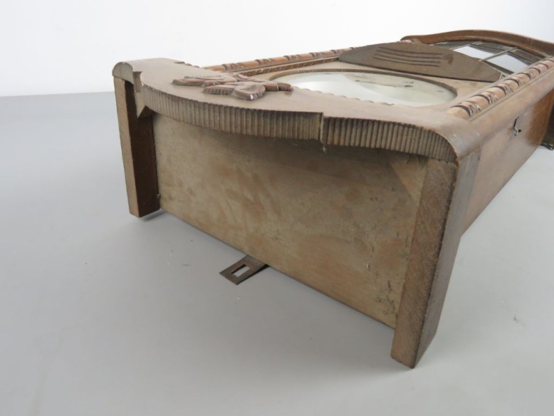Deze antieke houten wandklok is een klassiek voorbeeld van een regulateur uit het midden van de 20e eeuw (circa 1930-1950). De klok combineert een robuuste eikenhouten kast met strakke geometrische details.
