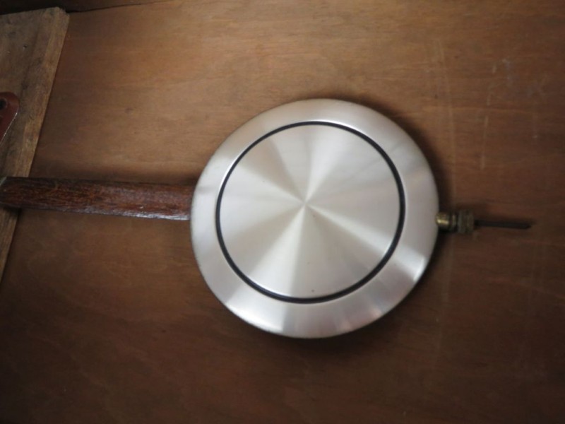 Slinger: De klok heeft een grote, ronde metalen slingerschijf (pendule) aan een houten slingerstang.
