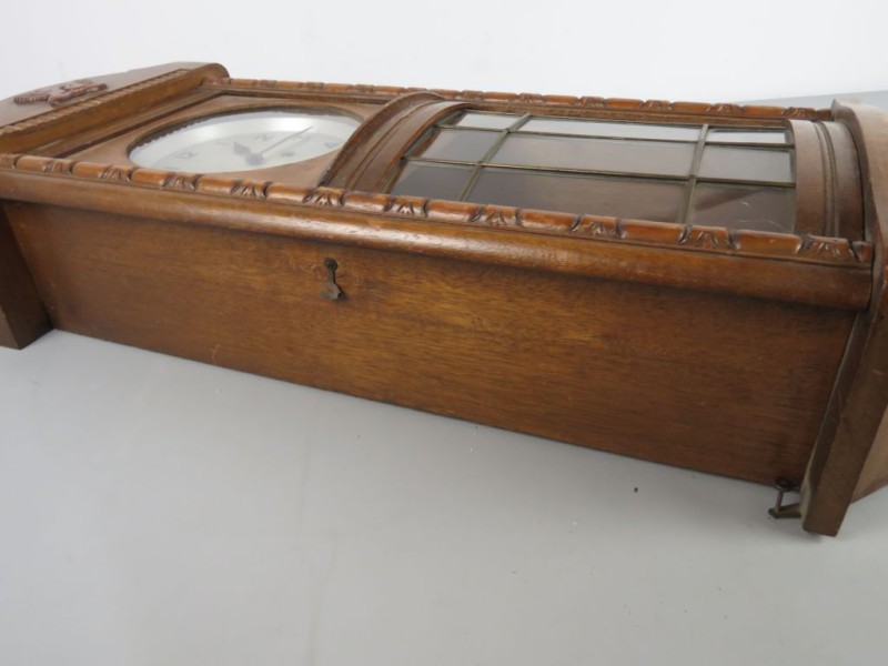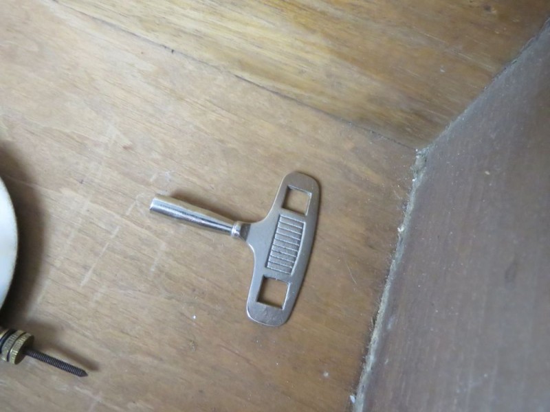 Type: Het betreft een mechanisch uurwerk dat moet worden opgewonden met de meegeleverde opwindsleutel. De twee gaten in de wijzerplaat geven aan dat de klok beschikt over zowel een loopwerk als een slagwerk (waarschijnlijk een slag op het hele en halve uur).