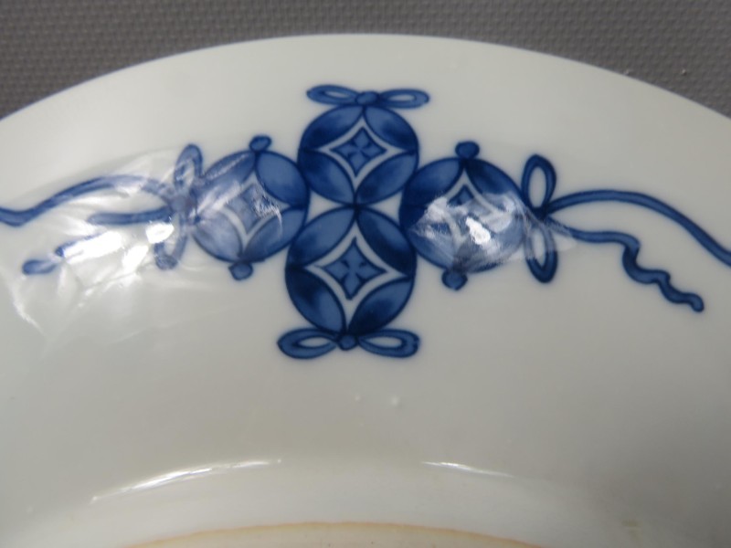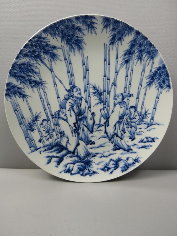 Antieke/vintage Japanse porseleinen schotel in Arita-ware - Imari blauw en wit kleur, begin 20e eeuw, met tekeningen van groep geleerden in een bamboebos. De achterkant van het bord is gesigneerd en heeft een motief van ronde bloemen.