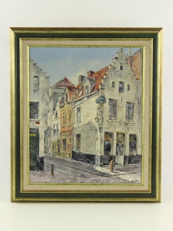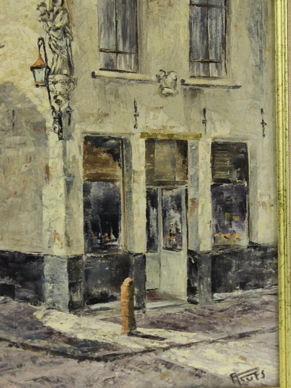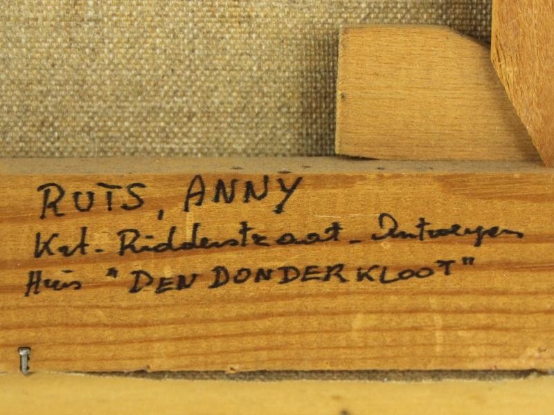 Dit olieverfschilderij op doek, getiteld “Korte Ridderstraat – Huis Den Donderkloot”, toont een sfeervol stadsgezicht in het historische centrum van Antwerpen. Het werk is rechtsonder gesigneerd met A. Ruts, en op de achterzijde van het houten spieraam staat in pen genoteerd: “Ruts Anny – Kort. Ridderstraat – Antwerpen – Huis ‘Den Donderkloot’”.