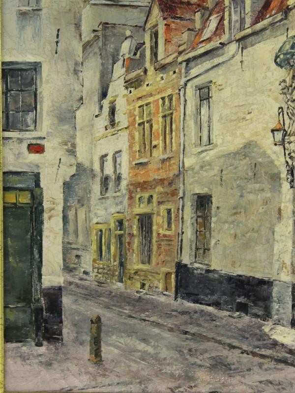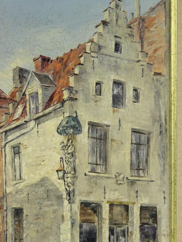 De voorstelling brengt een karakteristiek stukje Antwerpse stadsarchitectuur tot leven, met trapgevels, roodbruine dakpannen en verweerde gevels in zachte aardetinten. De schilder heeft een genuanceerd kleurgebruik toegepast, met subtiele overgangen in grijs, oker en rood die samen een warme, realistische sfeer oproepen. De losse penseelvoering en aandacht voor lichtreflecties op gevels en straatstenen versterken de levendigheid van het tafereel.