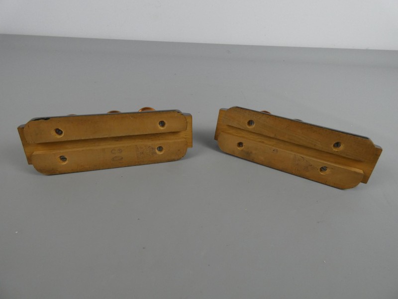 set van twee houten kandelaars in de kenmerkende Art Deco stijl. Deze unieke objecten combineren een strak, trapsgewijs ontwerp met industriële accenten.