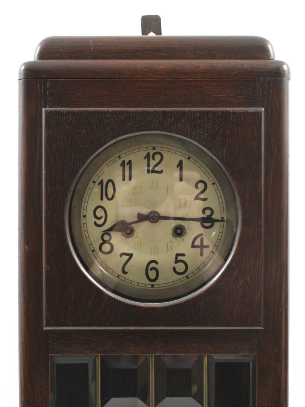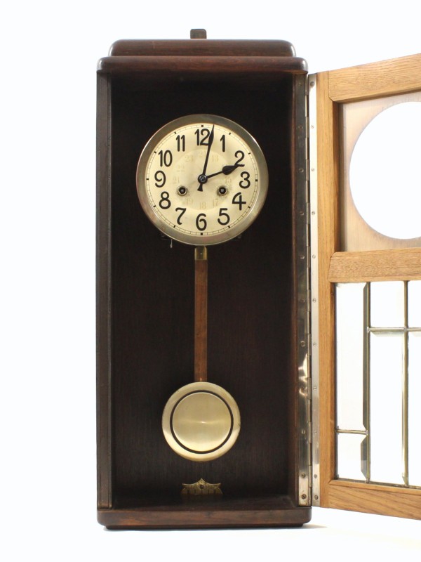 Deze fraaie Art Deco wandklok is gehuisvest in een stijlvolle donkerhouten kast met strakke, karaktervolle lijnen en een prachtig vormgegeven pendeldeur voorzien van geometrisch facetglas — een treffend voorbeeld van de ingetogen elegantie die de Art Deco-stijl zo kenmerkt.