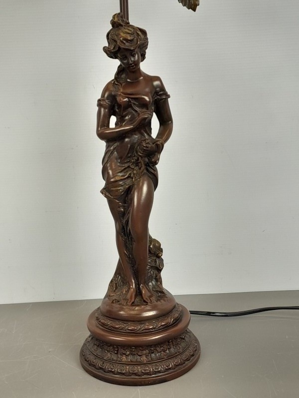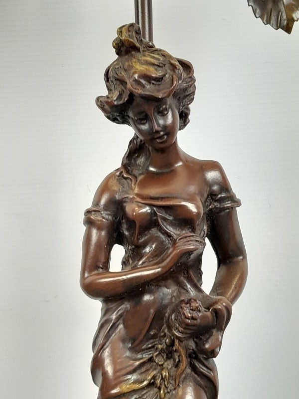 - De lamp is vormgegeven als een sierlijke vrouw die leunt tegen een gebogen stengel, versierd met bladmotieven.