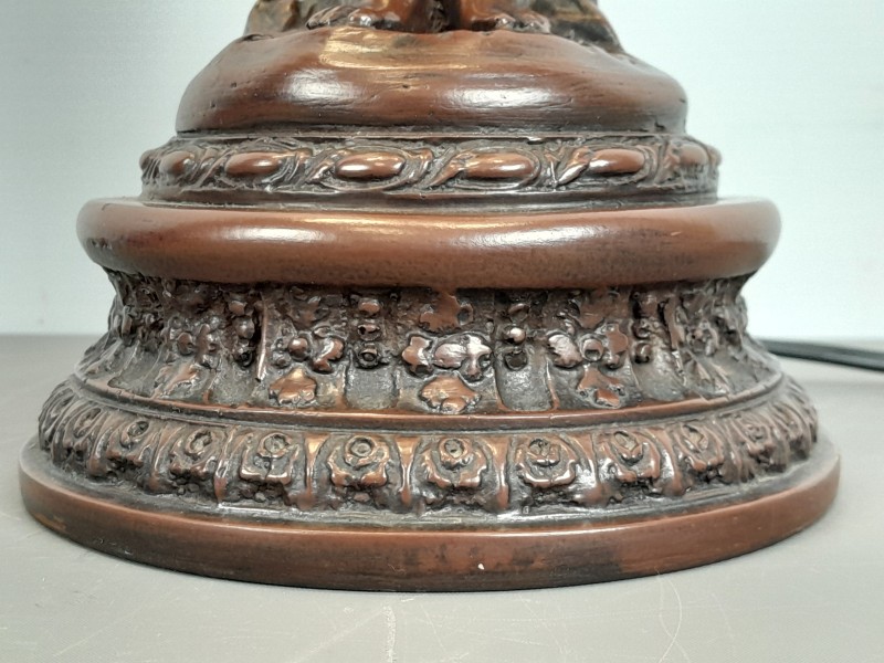 - Het geheel is uitgevoerd in metaal met een bronskleurige afwerking en rust op een rijk gedetailleerde voet, typerend voor de weelderige Art Nouveau-stijl uit het begin van de 20e eeuw.