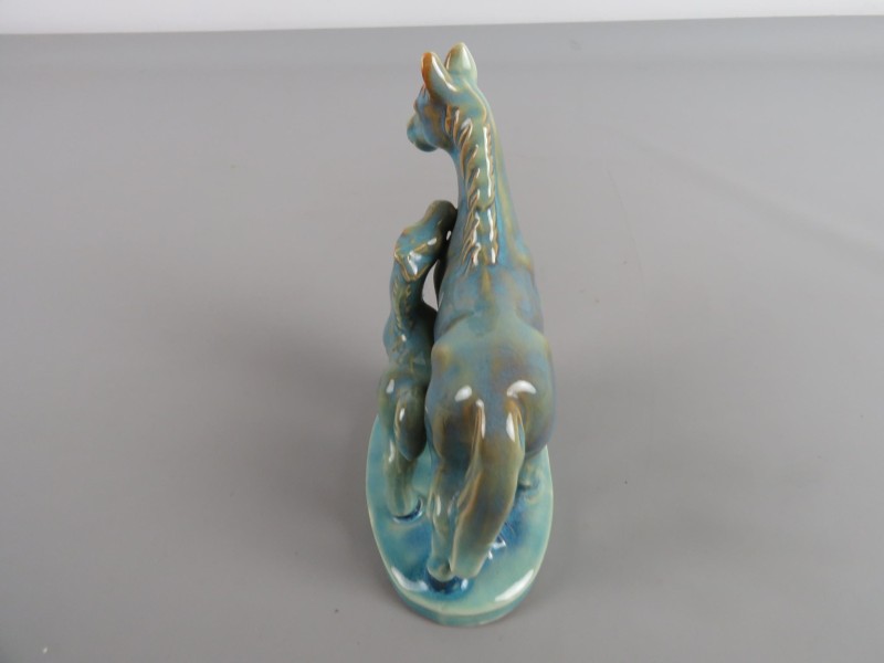 Keramisch beeld van een merrie en haar veulen. Blauw geverfd.