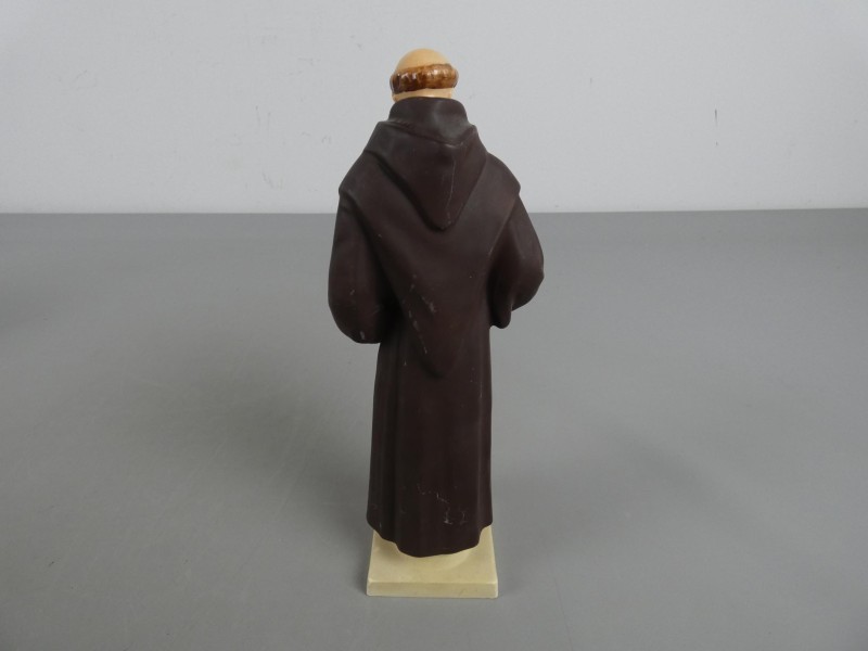 Dit porseleinen beeldje van de bekende fabrikant Goebel is gemarkeerd met het Sacrart-label en stamt uit West-Duitsland. Het object verkeert in een nette staat en vertoont slechts lichte gebruikssporen op het bruine gewaad. De onderzijde is voorzien van het ingeperste modelnummer HF4/II en het blauwe fabrieksstempel. Afmetingen: H27cm x B10cm x L9cm, Gewicht: 0,46kg