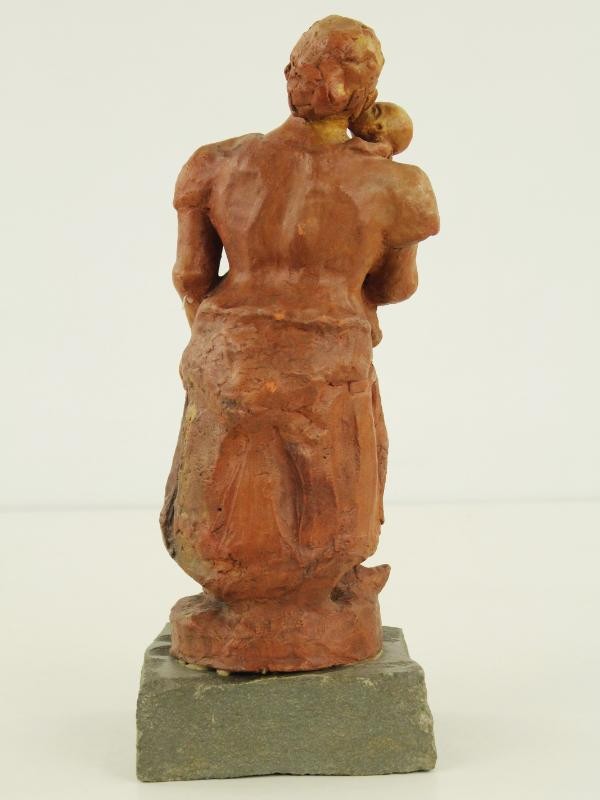 Dit beeld stelt een moeder met kind voor en is uitgevoerd in terracottakleurige klei. De figuren zijn in een staande houding weergegeven, waarbij het kind tegen de moeder wordt gedragen. De vormen zijn vereenvoudigd en licht gestileerd, met aandacht voor lichaamshouding en onderlinge verbondenheid. Het geheel rust op een stenen sokkel, die zorgt voor een stabiele basis.