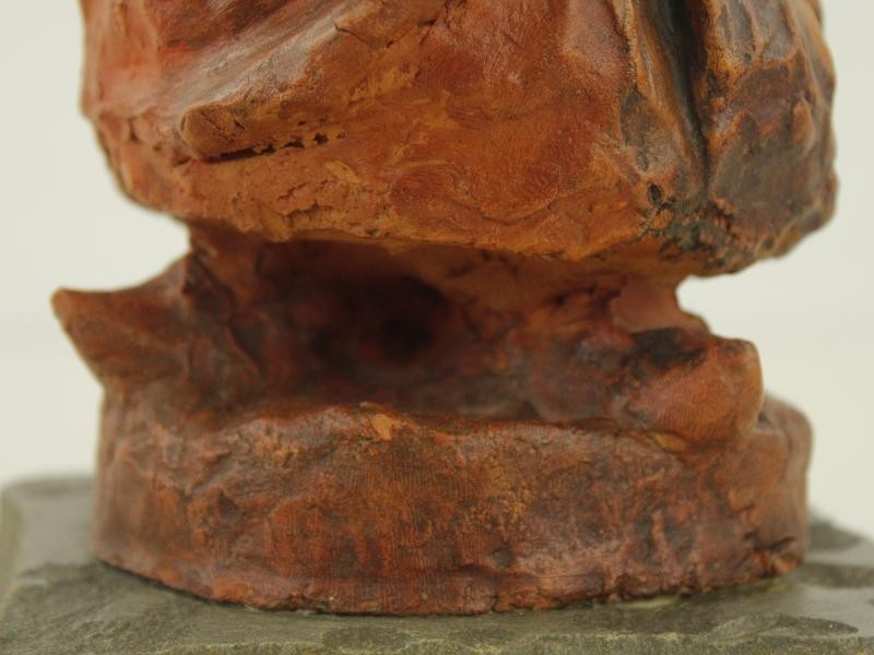 Het oppervlak vertoont een natuurlijke, matte structuur met zichtbare modellering, kenmerkend voor handgevormde kleisculpturen. Het kleurgebruik bestaat hoofdzakelijk uit warme aardetinten, variërend van roodbruin tot oker, wat bijdraagt aan een sobere en ingetogen uitstraling. Het materiaalgebruik en de afwerking sluiten aan bij een figuratieve en expressieve stijl, waarbij de nadruk ligt op vorm en volume eerder dan op fijne detaillering.