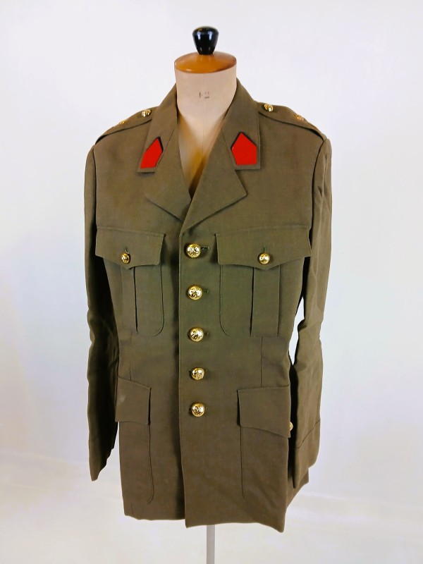 Compleet Belgisch militair uniformpakket, uit de jaren 1980. Bevat twee uniformvesten met gekleurde rangkentekens (blauw en rood)en bijpassende broeken, een donkergroene regenjas, hemden (1 nog in verpakking), sokken, handschoenen, onderhemdje, das, barret, veldfles, turnpantoffels (maat 43), handdoekjes, veters, naaisetje, scheermesjes, scheerborstel, zakdoeken, lockersleutel en schoenborstel. Alles zit netjes opgeborgen in een stevige legerkoffer met stickers. De kledingstukken zijn in maat 48 en een lijst is toegevoegd van toenDit type set werd gebruikt tijdens de basisopleiding van Belgische dienstplichtigen. Interessant voor verzamelaars van militaire memorabilia of als decorstuk.