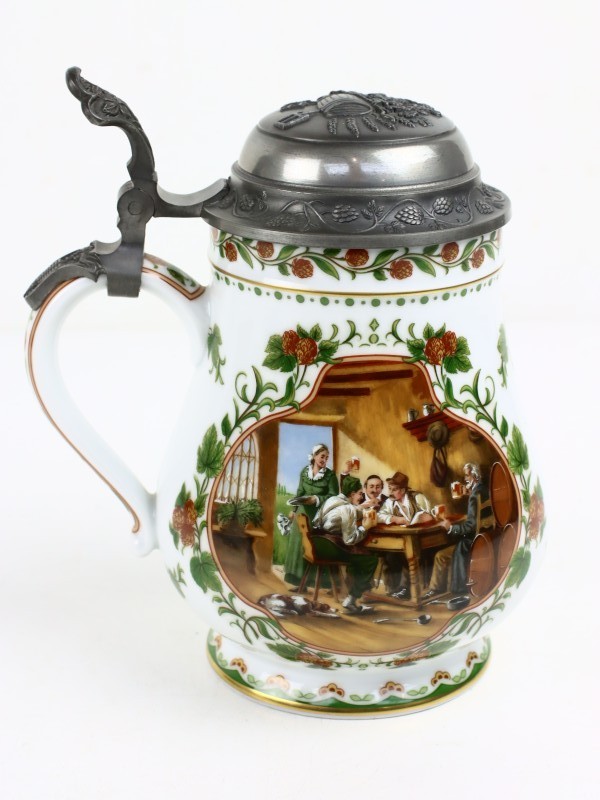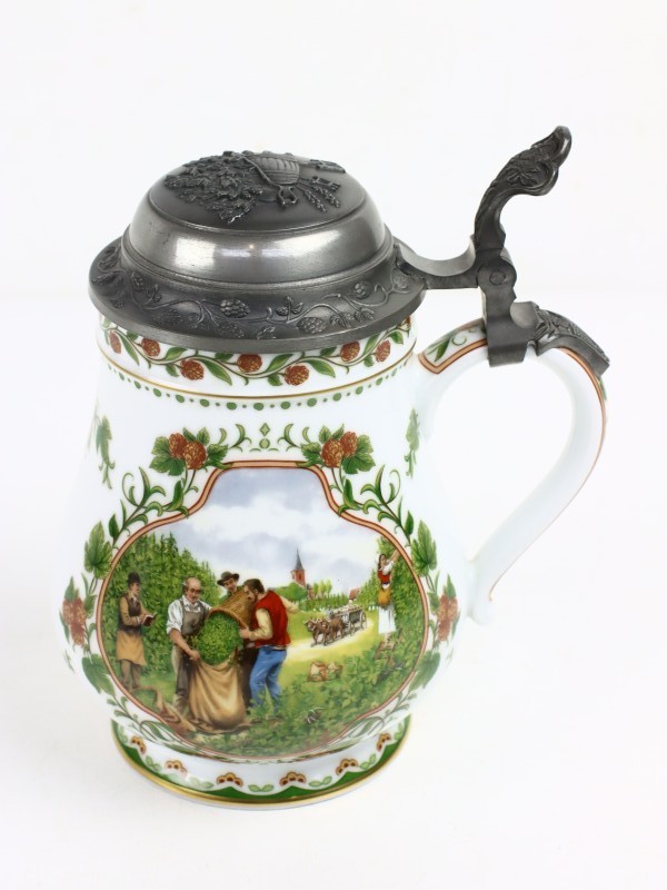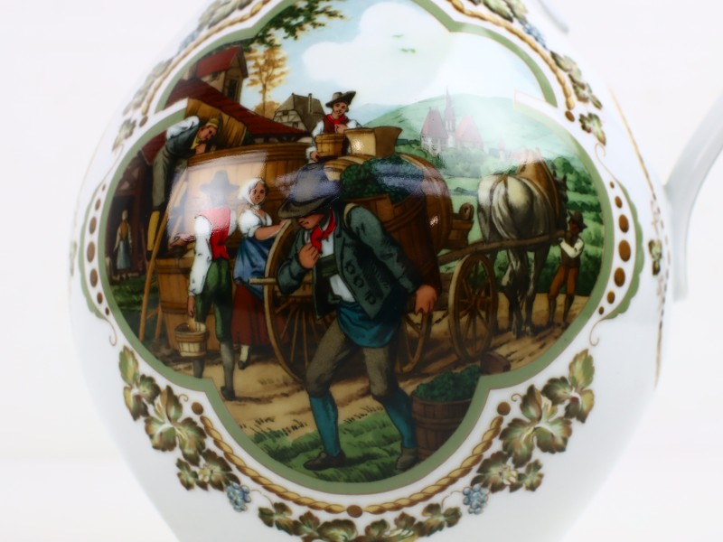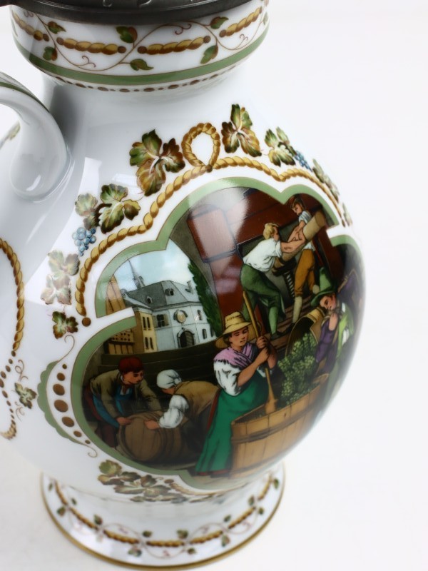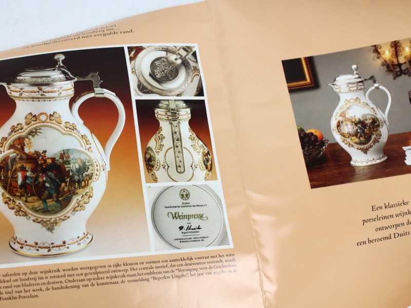 1. De grote is uit de gelimiteerde serie ‘De Wijnpers’ van Franklin Porcelain, ontworpen door Rupert Schneider en uitgebracht in 1986. De serie verwijst naar klassieke wijnoogstscènes en combineert hoogwaardig porselein met functionele metalen deksel van fijn tin.