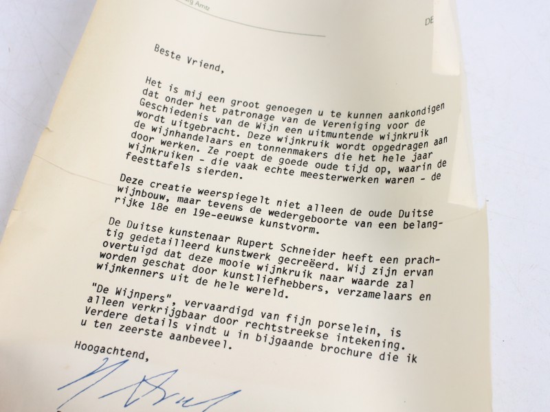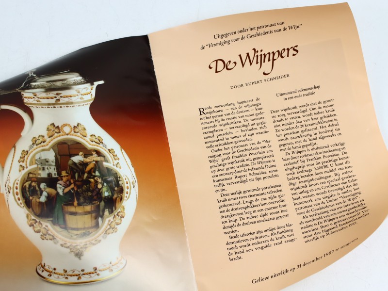 Wordt geleverd met de originele certificaten van echtheid (2 november 1987), waarmee de authenticiteit van de gelimiteerde editie wordt bevestigd, ook aankoopinfo. De serie ‘De Wijnpers’ is een voorbeeld van het vakmanschap en de artistieke signatuur van Franklin Porcelain in de jaren 1980, waarbij porselein en metaal samenkomen in een elegant en verzamelwaardig object.