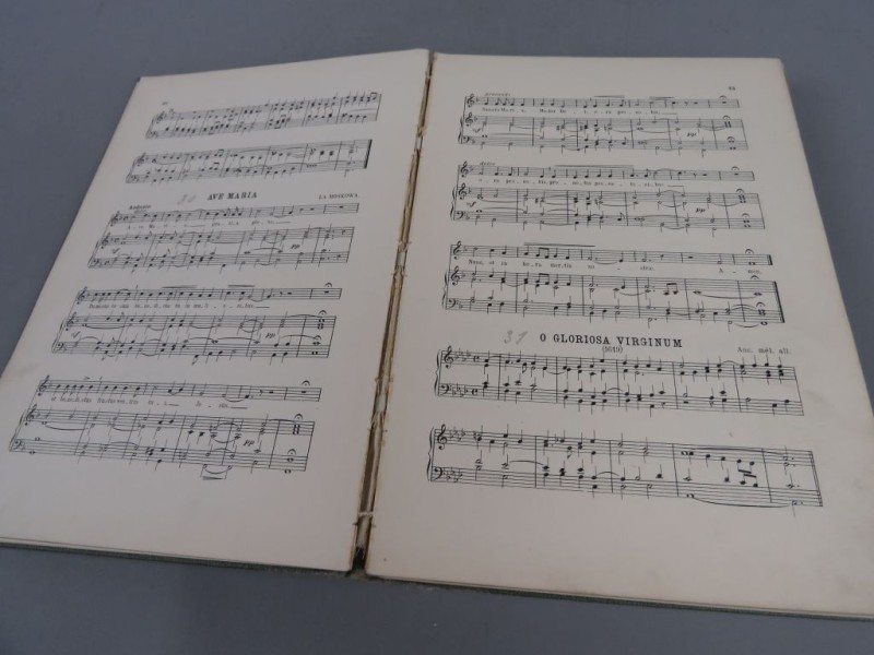 Een statige verzameling van religieuze composities. Met een aanzienlijke rugdikte van 3,3 cm biedt dit werk een omvangrijke selectie aan partituren, waarschijnlijk bedoeld voor koor- of orgelbegeleiding. De binnenzijde bevat gedetailleerde muzieknotatie op licht vergeeld papier, wat getuigt van de respectabele leeftijd en het intensieve gebruik in het verleden. Het is een indrukwekkend negentiende-eeuws document dat de sacrale sfeer van die tijd perfect weerspiegelt.