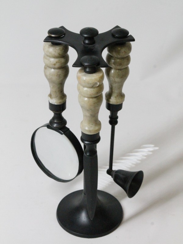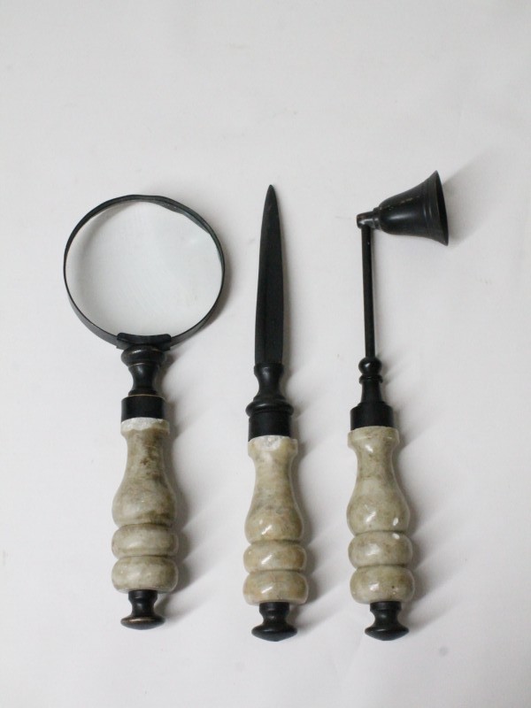 Een decoratieve set van kantoorgereedschap, bestaande uit een brievenopener, een vergrootglas en een kaarsdover, die in een bijpassende standaard worden bewaard. De handvatten lijken gemaakt te zijn van onyx of een soortgelijk lichtgekleurd steenachtig materiaal, terwijl de standaard en de metalen delen van het gereedschap van donker metaal zijn.