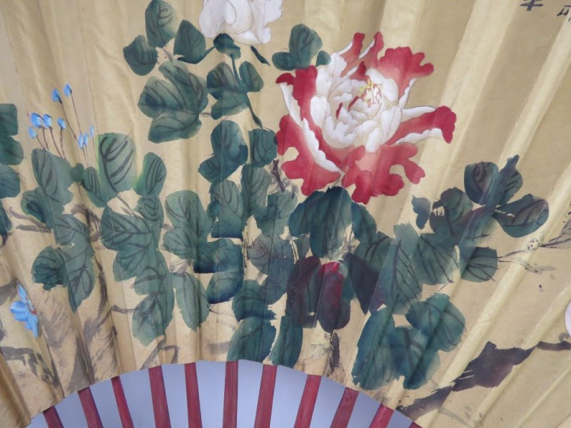 Een grote, opvouwbare handwaaier met een Chinese stijl, waarschijnlijk bedoeld voor wanddecoratie of als display-item, gezien de afmetingen 138 breed bij 76 cm hoog.