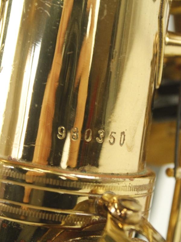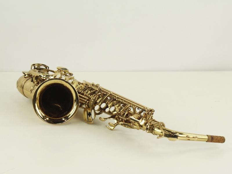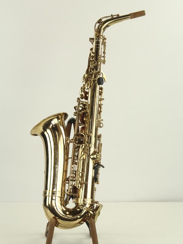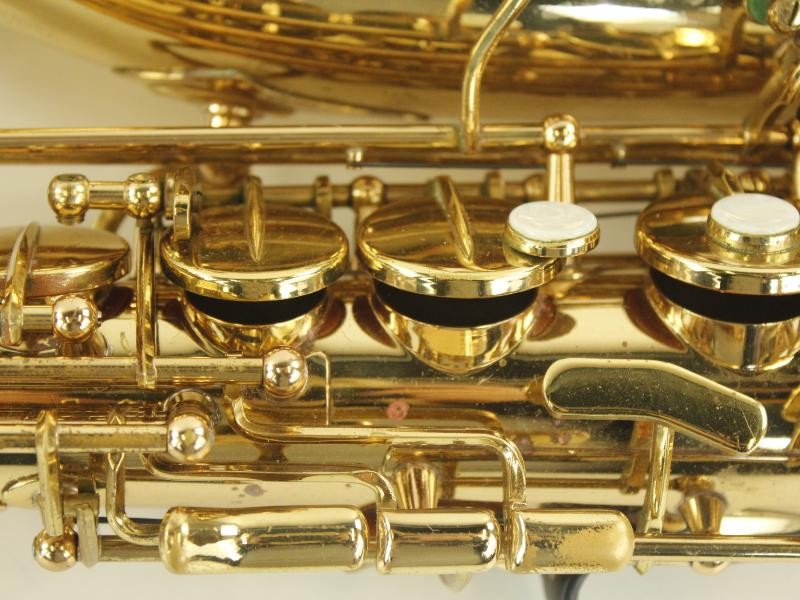 De saxofoon heeft een mooie goudkleurige lak, met fijne mechaniek en klassieke details.
