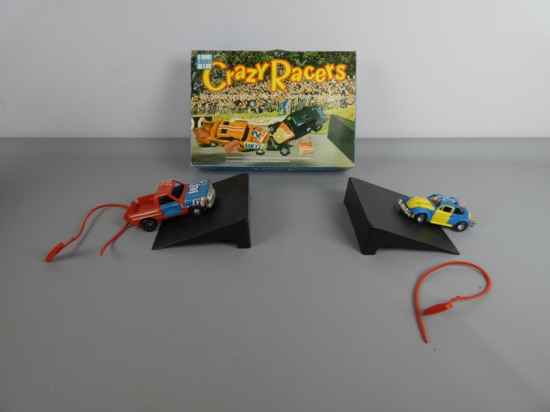 Er staat tekst op de doos in het Nederlands en Frans, onder andere: "2 Crazy Racers compleet met startmechanismen, optionele rem en snelle stickers" en "2 Crazy Racers avec des starters et des tremplins de saut."