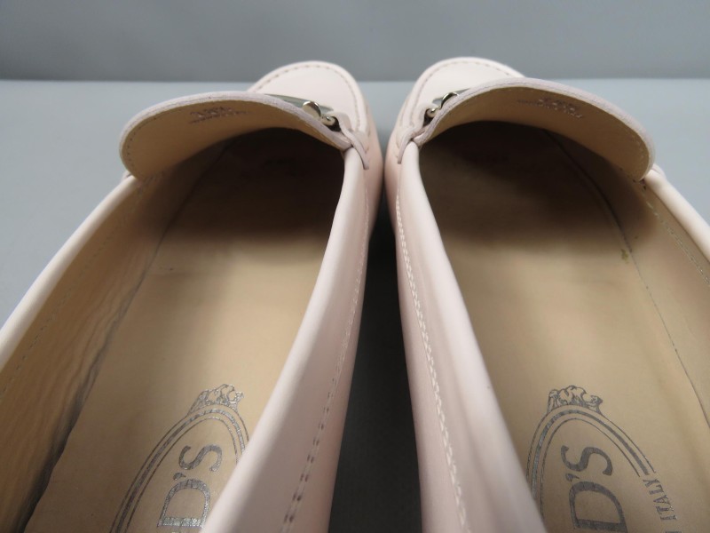 Gemaakt in Italië. Leren damesloafer in lichtroze/blozenkleur. Metalen staafje met Tods-merk in zilver. Leren binnenzool, buitenzool en hak met rubberen inzetstuk.