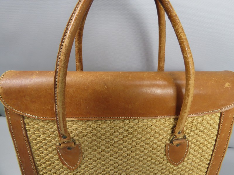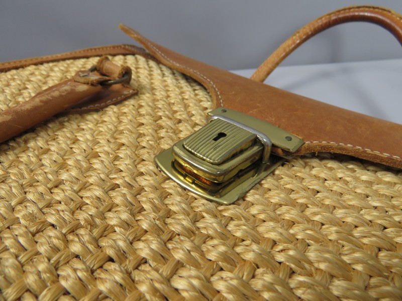 Dames handtas is een vintage-stijl handtas van gevlochten riet of raffia met cognac-kleurige lederen details. Het ontwerp kenmerkt zich door een groot lederen overslag (flap) en een opvallende messingkleurige kliksluiting met sleutelgat. Vermoedelijk uit de jaren 70.
