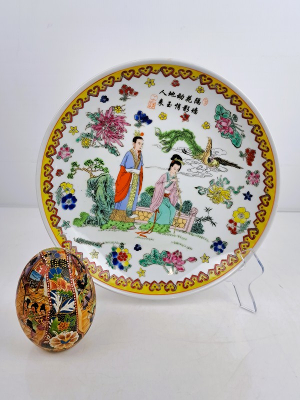 Het bord toont een traditioneel Chinees tafereel met een man en vrouw in een tuin, omringd door bloemen, vogels en kalligrafie in zwarte en rode karakters. De rand is rijk versierd met een geel-rood hartpatroon. Handgeschilderd in polychrome kleuren. Vermoedelijk tweede helft 20e eeuw. De achterzijde toont rode decoratieve stempels. -