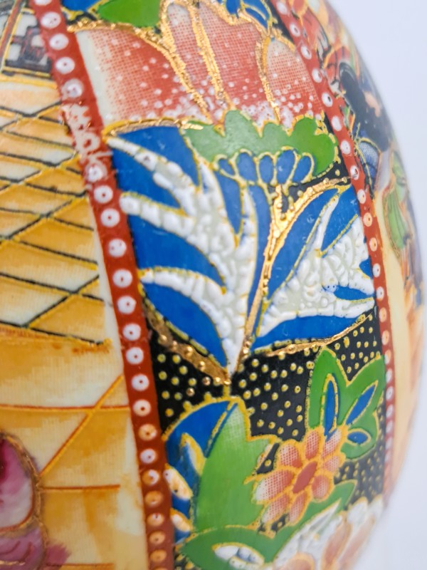 Ovaalvormig sierobject met rijk gedetailleerde taferelen van muzikanten en hofscènes. Veel gebruik van goudaccenten en verhoogde schildertechniek (moriage). Typisch voor Satsuma-invloeden, maar waarschijnlijk decoratief werk uit het midden tot eind 20e eeuw.