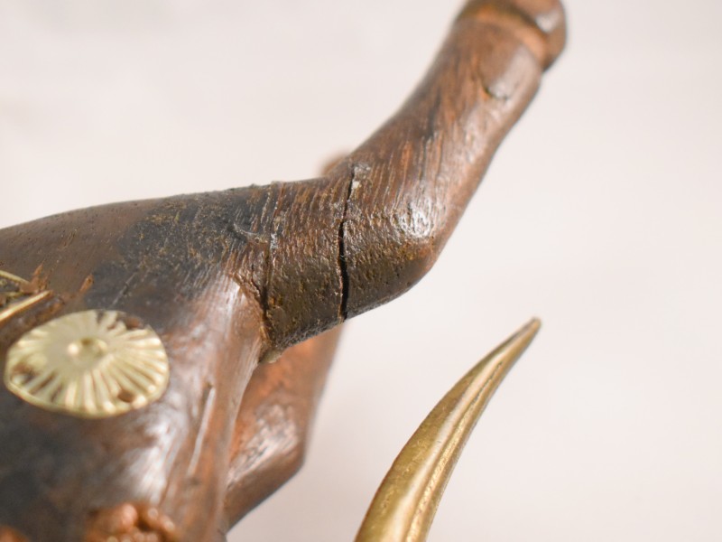 Handgemaakt houten paard met decoratieve details in koperkleurig en goudkleurig metaal. Het beeld toont een rijk versierd paard met zadel, tuig en versieringen, typisch voor Indiase of Aziatische stijl. De details zijn aangebracht met gehamerde en gegraveerde koperen en messing plaatjes. De staart is gemaakt van gebogen metaal. Het beeld is met de hand gesneden en heeft een rustieke, ambachtelijke uitstraling. Dit soort decorstukken werd vaak gebruikt als interieurdecoratie of souvenir en verwijst naar traditionele paardencultuur.