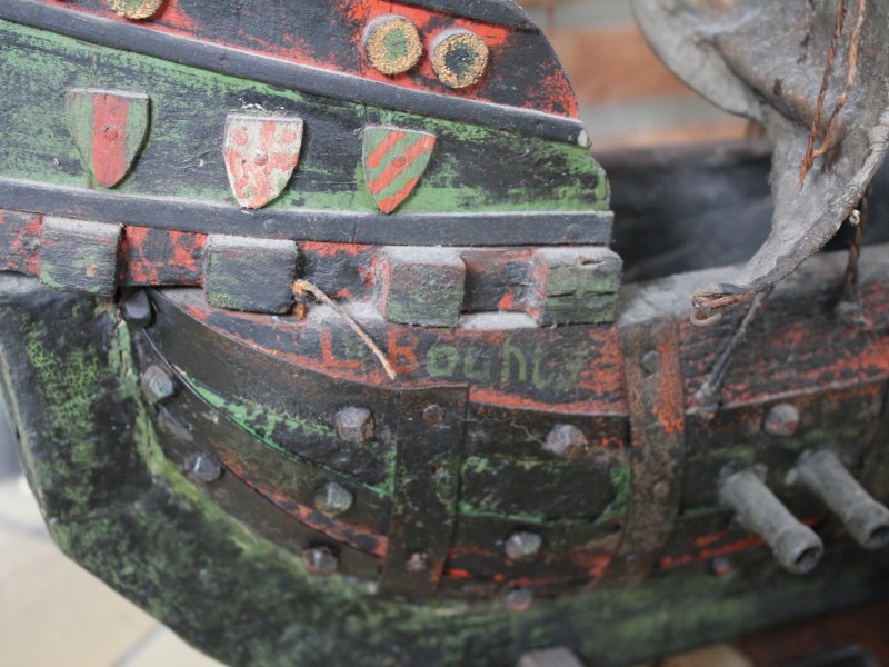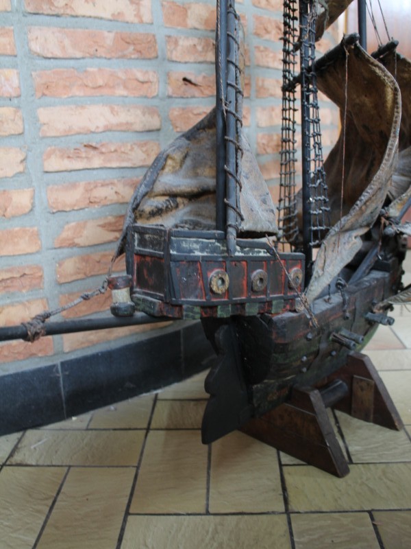 Decoratief houten zeilschip met textiele zeilen en gedetailleerde tuigage. Het model heeft een vintage, verweerde look en staat op een houten standaard. Een opvallend decoratiestuk voor in huis.