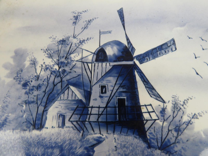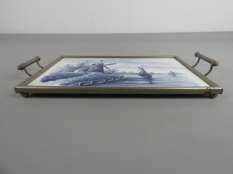 Kunststoffen plateau met metalen handvaten. Molen en boot op afgebeeld.