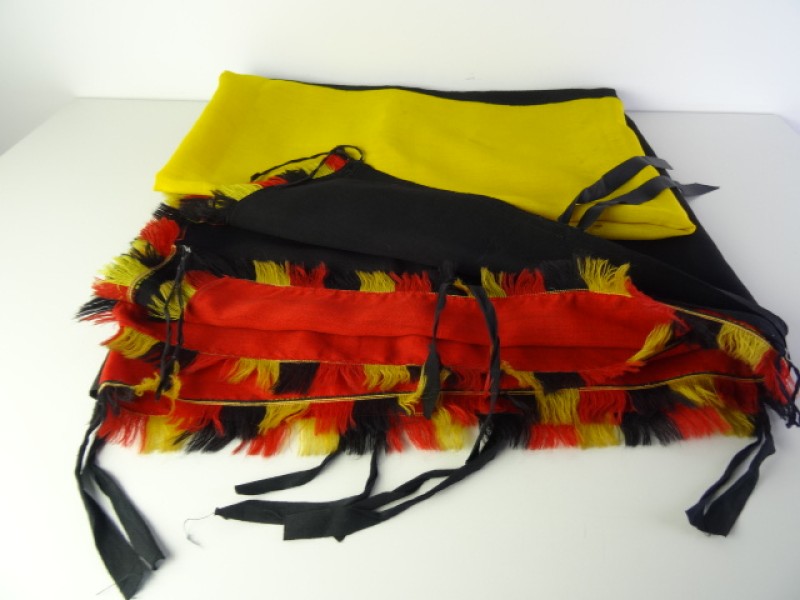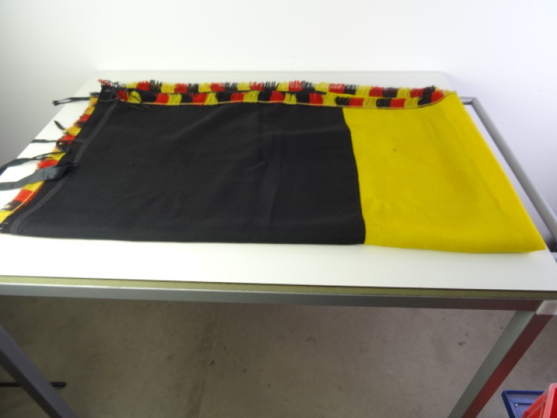 Prachtige decoratieve Belgische vlag in geweven textiel, uitgevoerd in de nationale kleuren zwart, geel en rood. De vlag is rondom afgewerkt met bijpassende franjes en voorzien van lintjes om eenvoudig op te hangen of vast te maken.