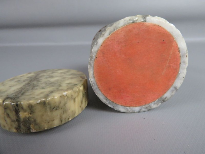 Bijpassende Pot: ( Ø 7 x H 12 cm) Een hoge, cilindrische pot met een deksel van hetzelfde gesteente. De pot is omrand met een glanzende messing band en de binnenzijde is ook met metaal afgewerkt. Deze diende waarschijnlijk voor sigaretten.