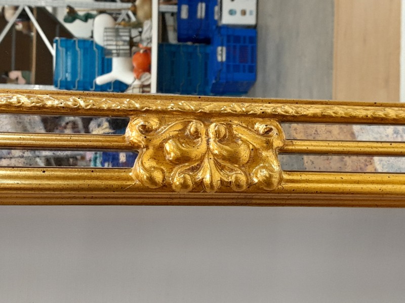 - De spiegel heeft een rijkelijk gedecoreerde, goudkleurige lijst waarin verfijnde spiegelstukken zijn verwerkt, wat zorgt voor een prachtig spel van licht en reflectie.
