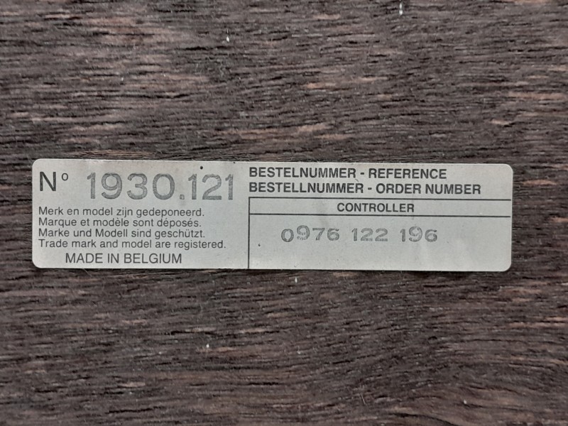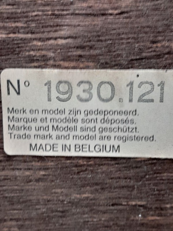 - De spiegel draagt het originele label met referentienummer 1930.121 en de vermelding “Merk en model gedeponeerd – Made in Belgium”, wat zijn authenticiteit en Belgische makelij bevestigt.